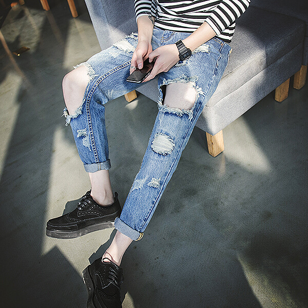 - Quần jean nam rách gối phong cách thiết kể kiểu quần jean cổ điển nhưng vẫn toát lên vẻ mạnh mẽ, nam tính cho phái mạnh.